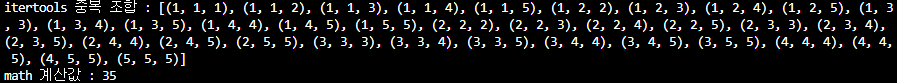 print(f'itertools 중복 조합 : {list(combinations_with_replacement(lst, 3))}')