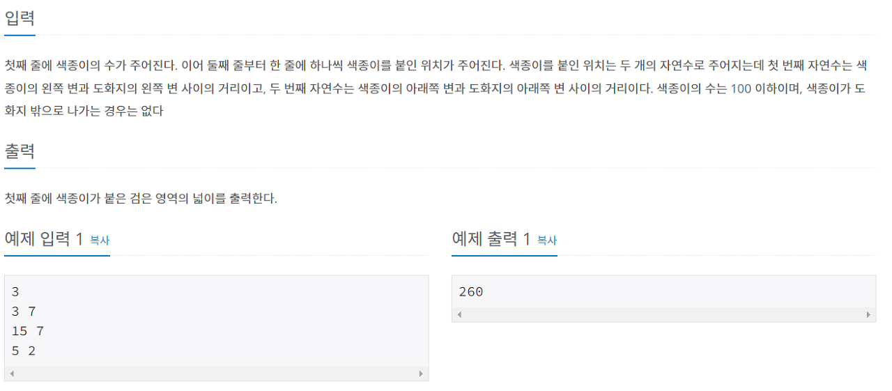 나 같은경우에는 딱 처음 이문제를 봤을땐 간단하게 색종이를 붙일때마다 겹치는 부분의 개수만 count 해서 계산 하면 될거같았지만 당연히...첫 코딩은 완전히 잘못 풀었었다..