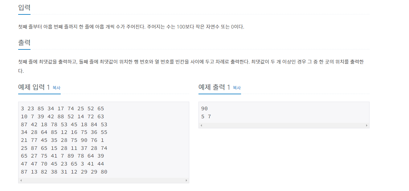 이 문제 같은 경우에는 9 * 9 라는 2차원 테이블을 주어졌으며 문제 자체에 2차원 배열내에 최댓값의 위치만 찾으면 되는 문제이다.