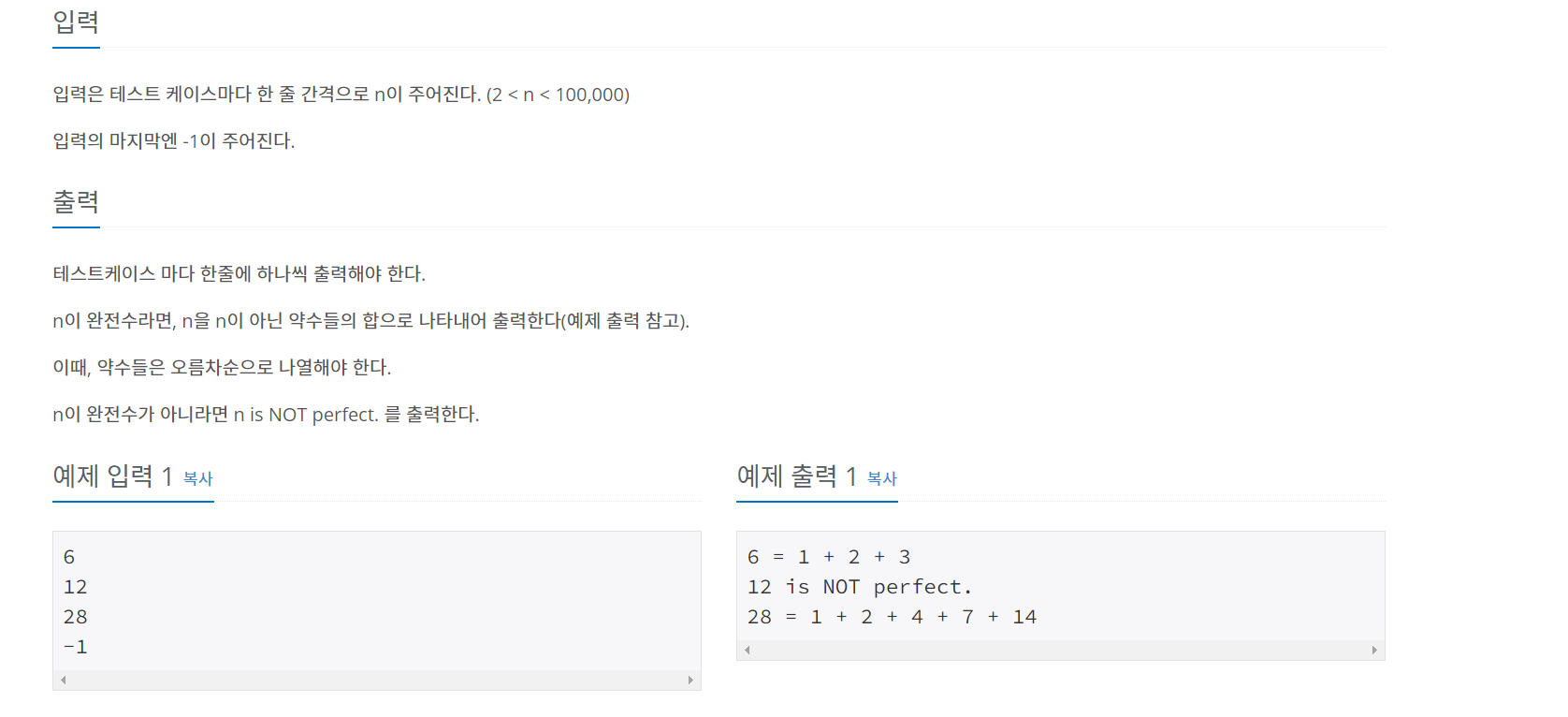 완전수라는 것을 구하기 위해 약수를 구하고 구해진 약수 리스트에 마지막 을 제외한 값이 N 또는 약수의 마지막 값이 같으면 출력을 하면되는 문제이다.