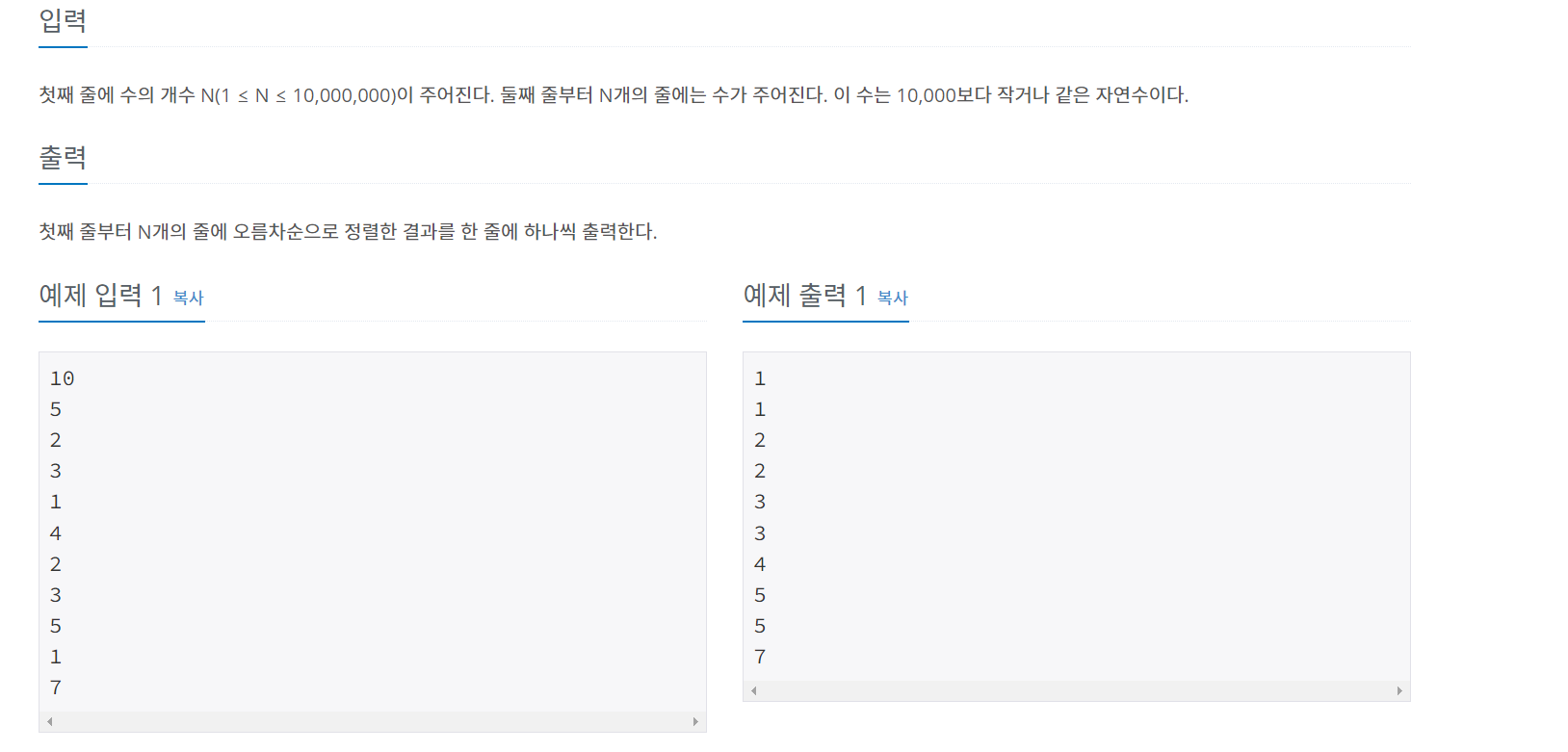 첫째 줄에 수의 개수 N(1 ≤ N ≤ 10,000,000)이 주어진다. 둘째 줄부터 N개의 줄에는 수가 주어진다. 이 수는 10,000보다 작거나 같은 자연수이다.
