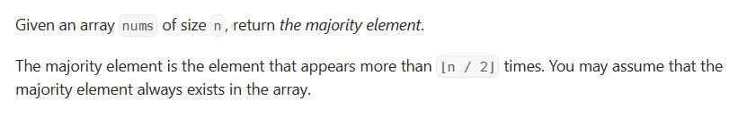 Can you solve this real interview question? Majority Element - Given an array nums of size n, return the majority element. The majority element is the element that appears more than ⌊n / 2⌋ times. You may assume that the majority element always exists