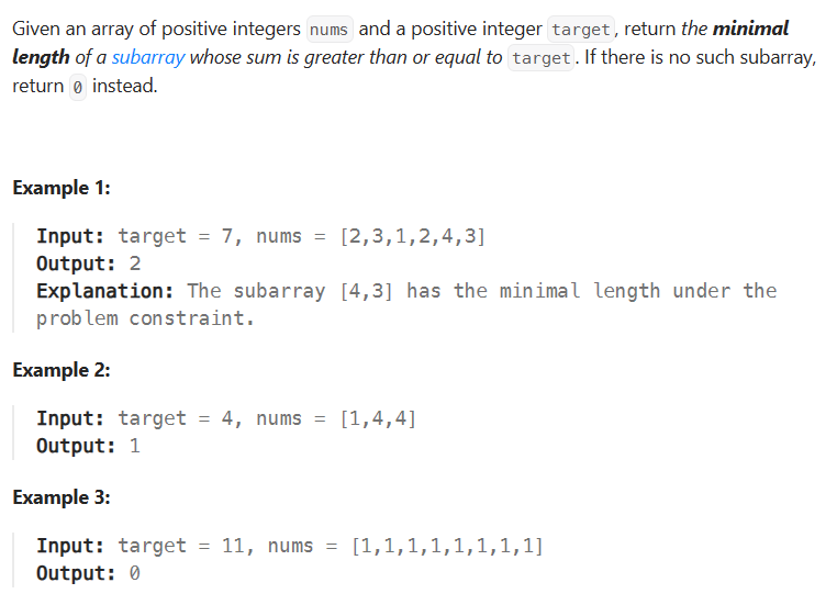 이 문제는 주어진 배열에서 target 값의 최소 길이를 반환 해주면 되는 문제이다.