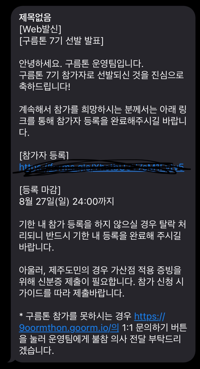 카페에서 공부를 하고있던 나는 갑자기 온 문자에 아주 당황 하며 기뻐했다. 이 구름톤 합격 일정 보다 일주일이나 빨리 나왔기 때문에 아무생각없이 문자를 보고 이게 보이스피싱인가...? 내가 왜 ..선발 ? 이라는 생각 을 잠시 하게 하였다.